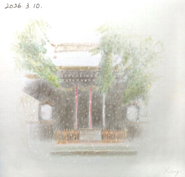 その日は結局午前のひと時しか降らなかったので、以前のような雪降り積もる光景とはならなかったが、それでも綿雪が降りしきる神社は風情があり、とても心に沁み入った。